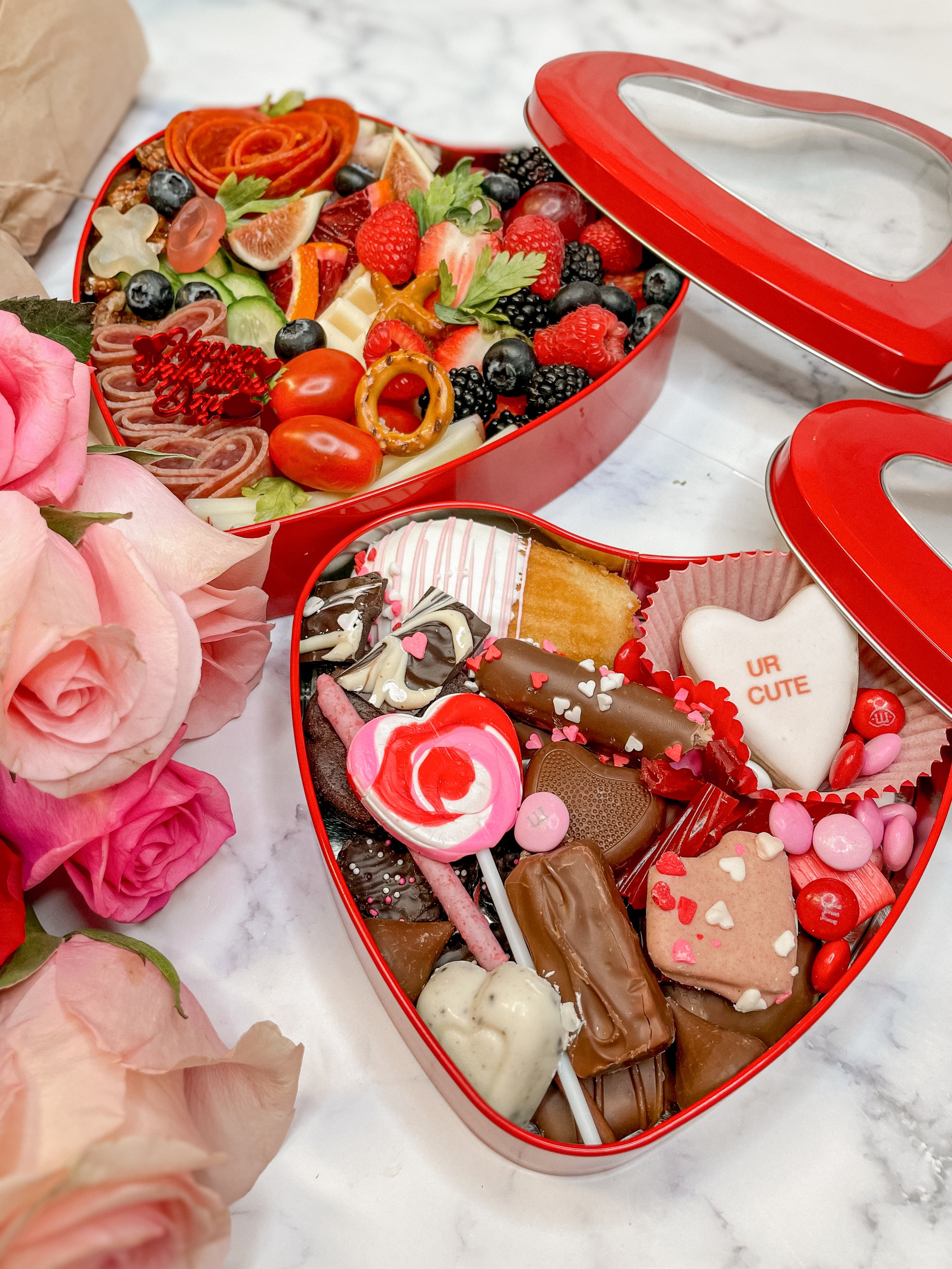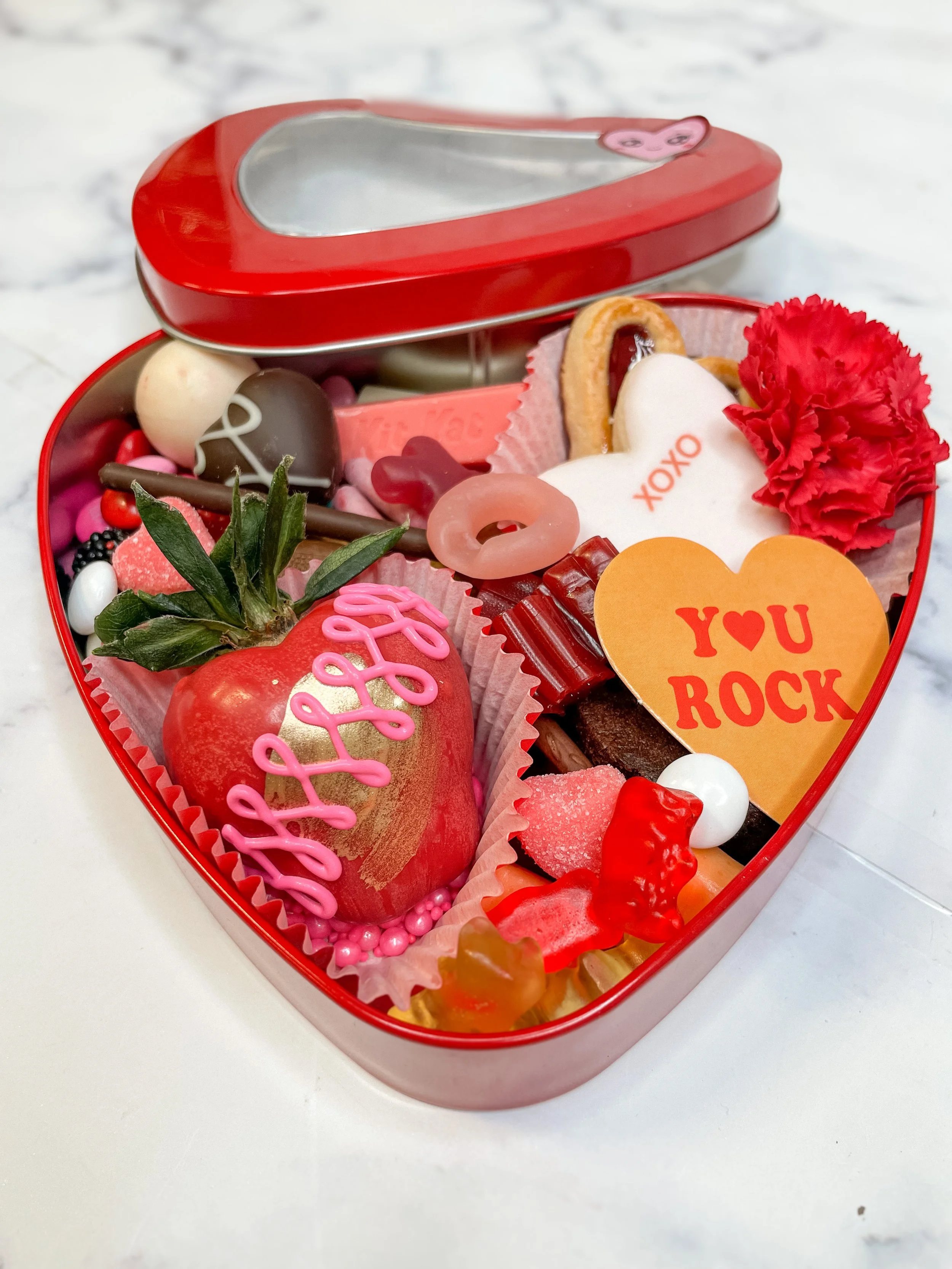 Filled with your choice of charcuterie items or a variety of Valentine’s sweets and treats. This includes one chocolate-covered strawberry from Shelby’s Strawberries (candy box only).